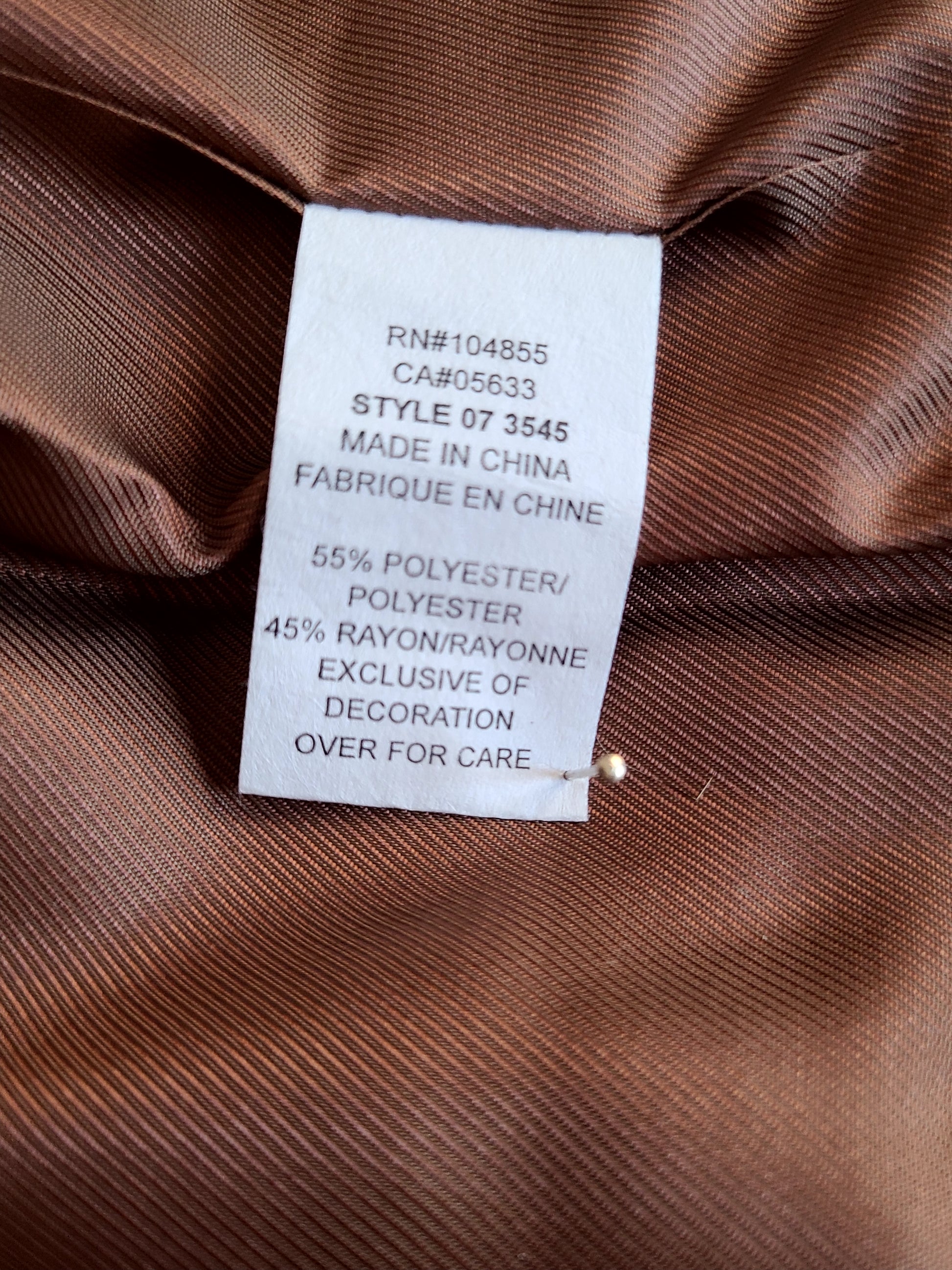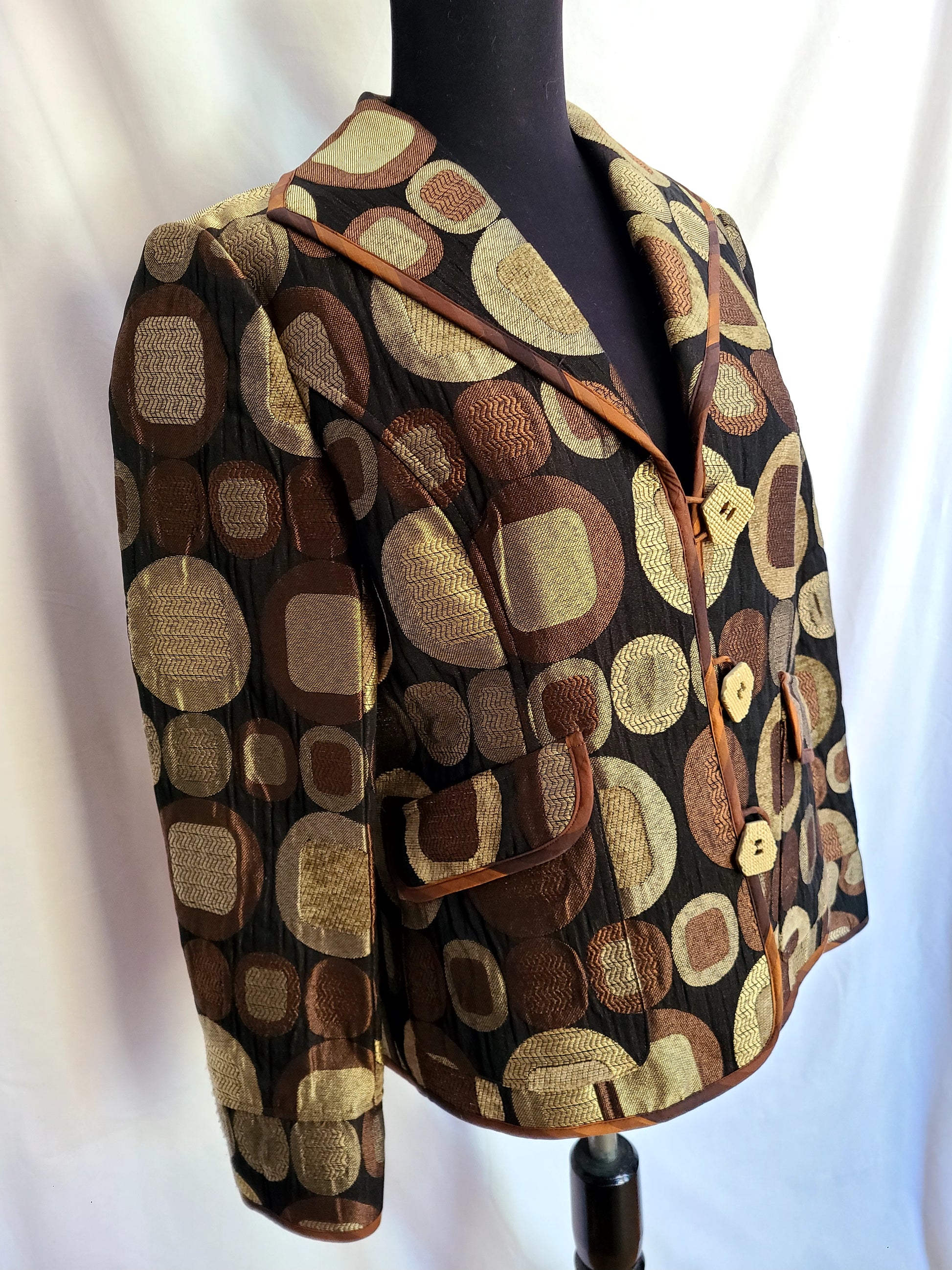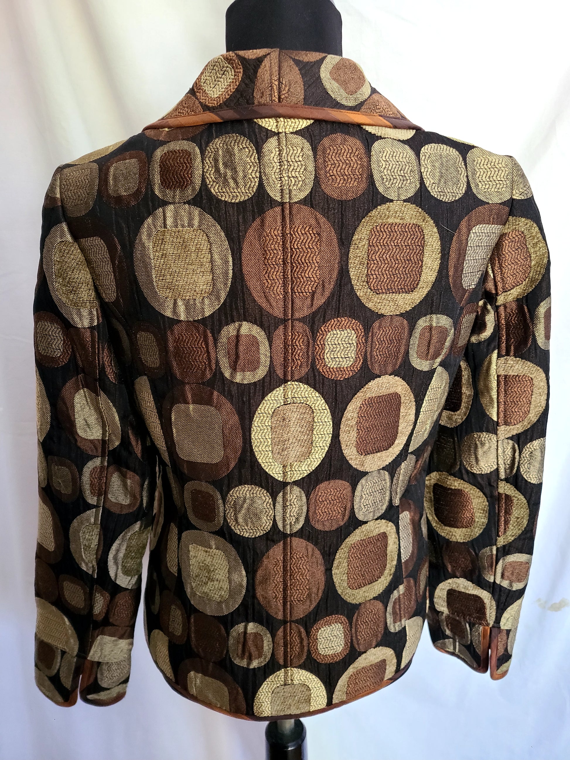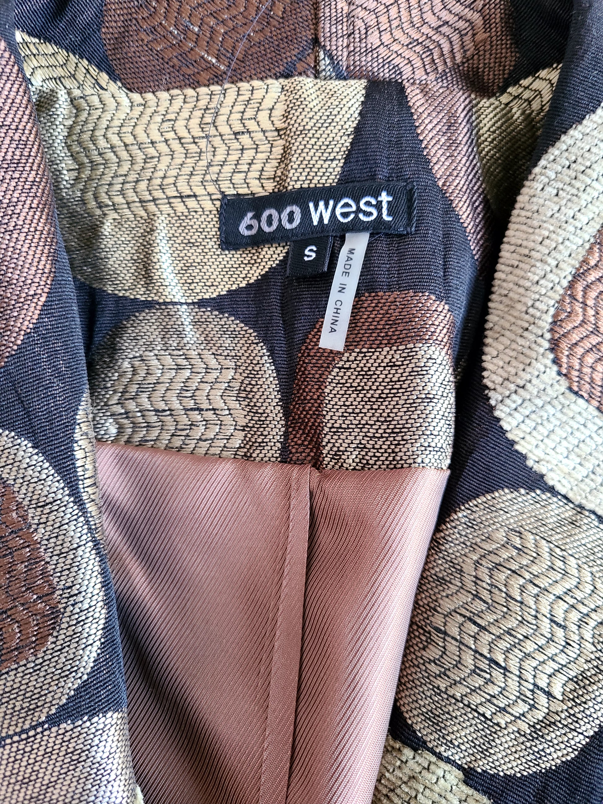 This ultra cool 600 West 60's print jacket features an abstract print in shades of brown, black, tan, and gold. The gold print has a subtle metallic sheen, adding a touch of sophistication to this exclusive piece.