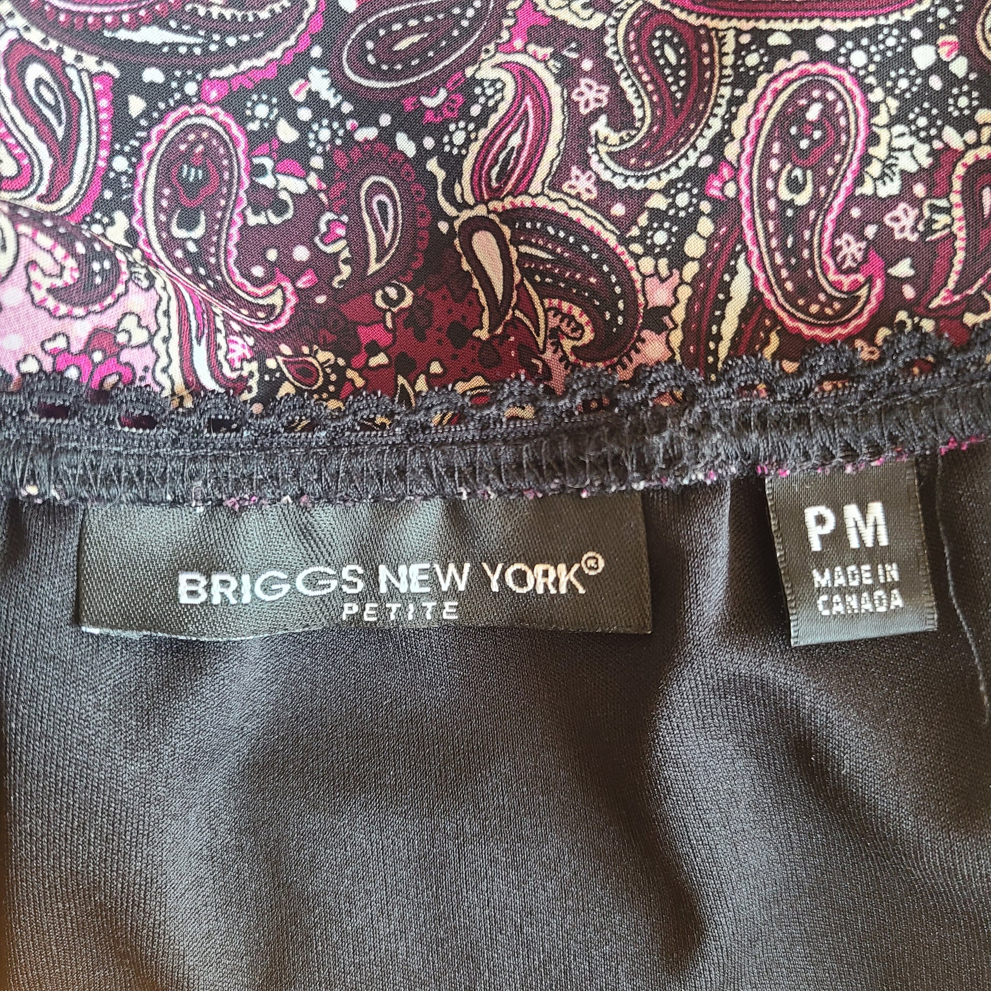 Purple and pink paisley swirl on a light polyester fabric. Waist is a lace elastic for a pretty look if you're wearing a crop top. The hemline is just at a 20" knee length point and finishes with a cute ruffle.