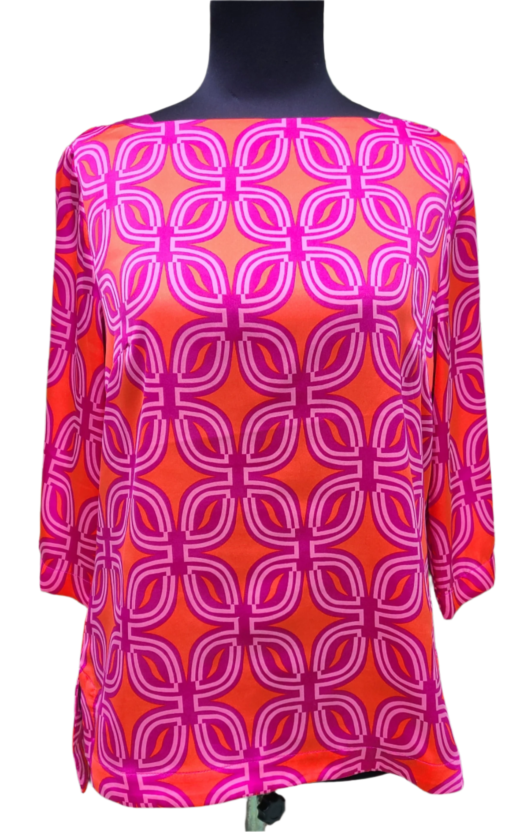Experience the stunning beauty of the Mod Print Blouse in a vibrant mix of magenta and orange. Featuring a chic boat neck and made from 100% polyester, this blouse is sure to make a statement.