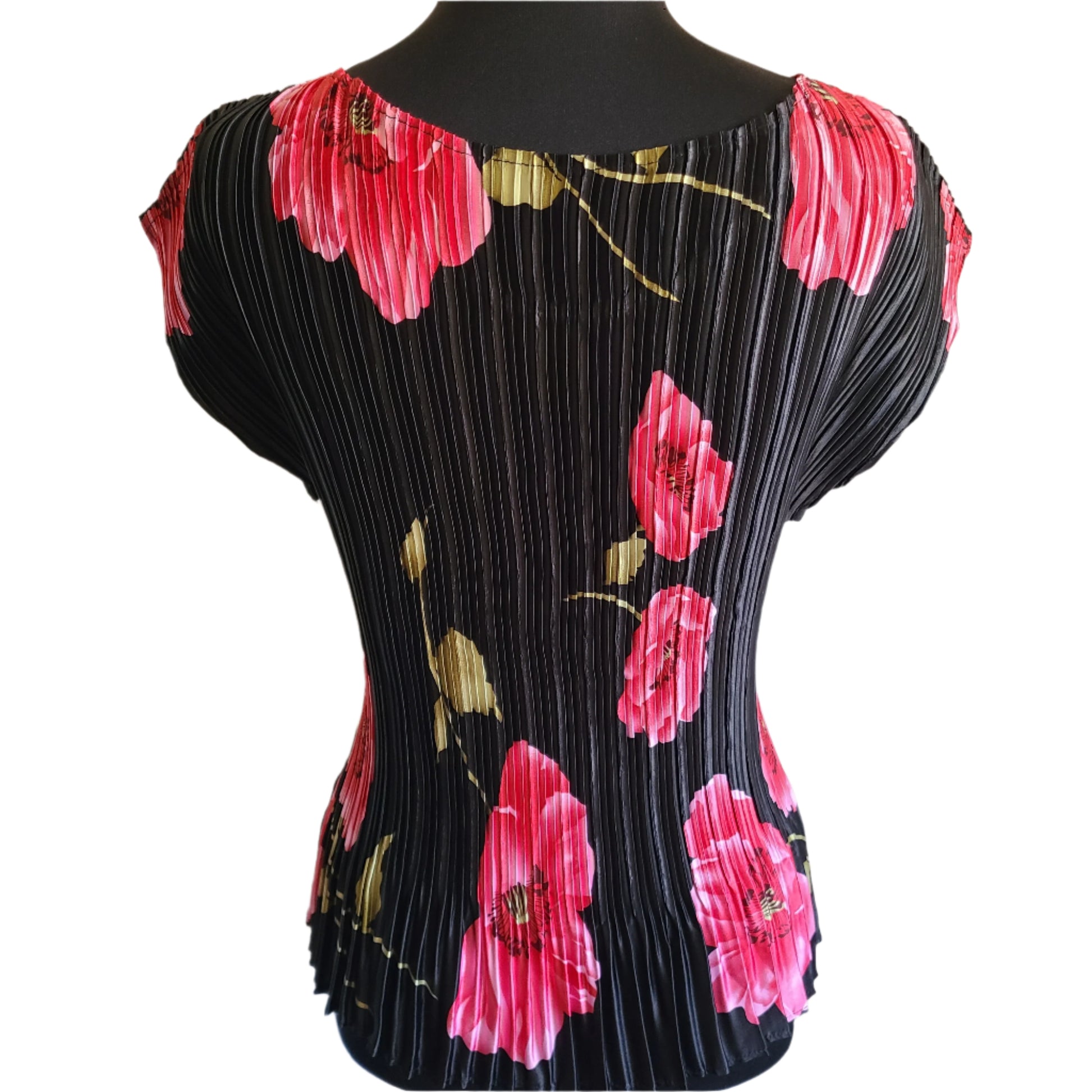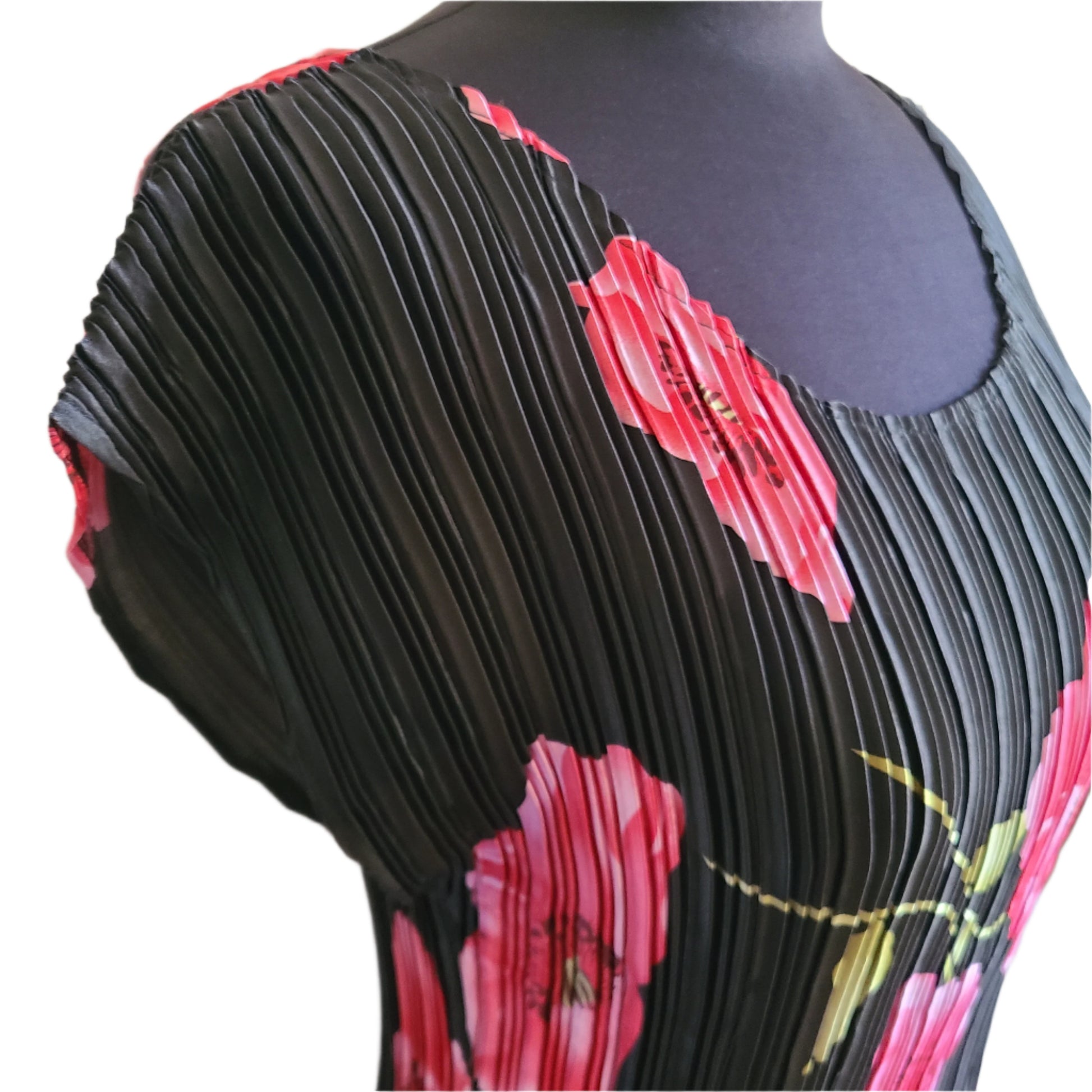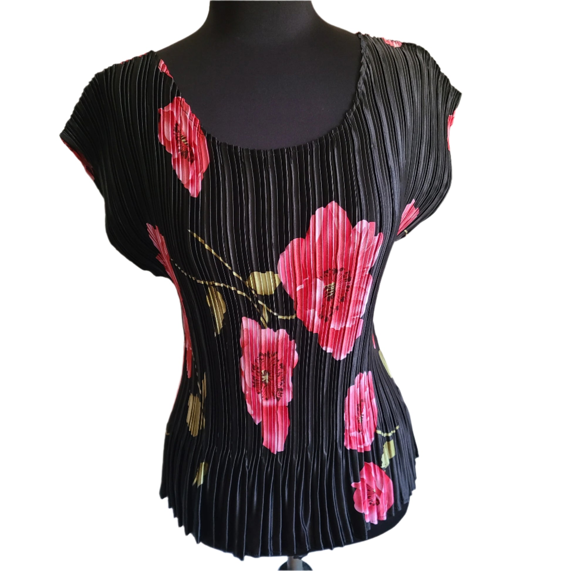 Graphic Flower Print blouse has a sexy scoop neckline and pretty mini pleats, adding texture and interest. Defined waist with a little flare. The pleats have a lot of stretch but snap back to hold its form. Cap Sleeves. Blouse. No labels. Excellent pre-owned condition.