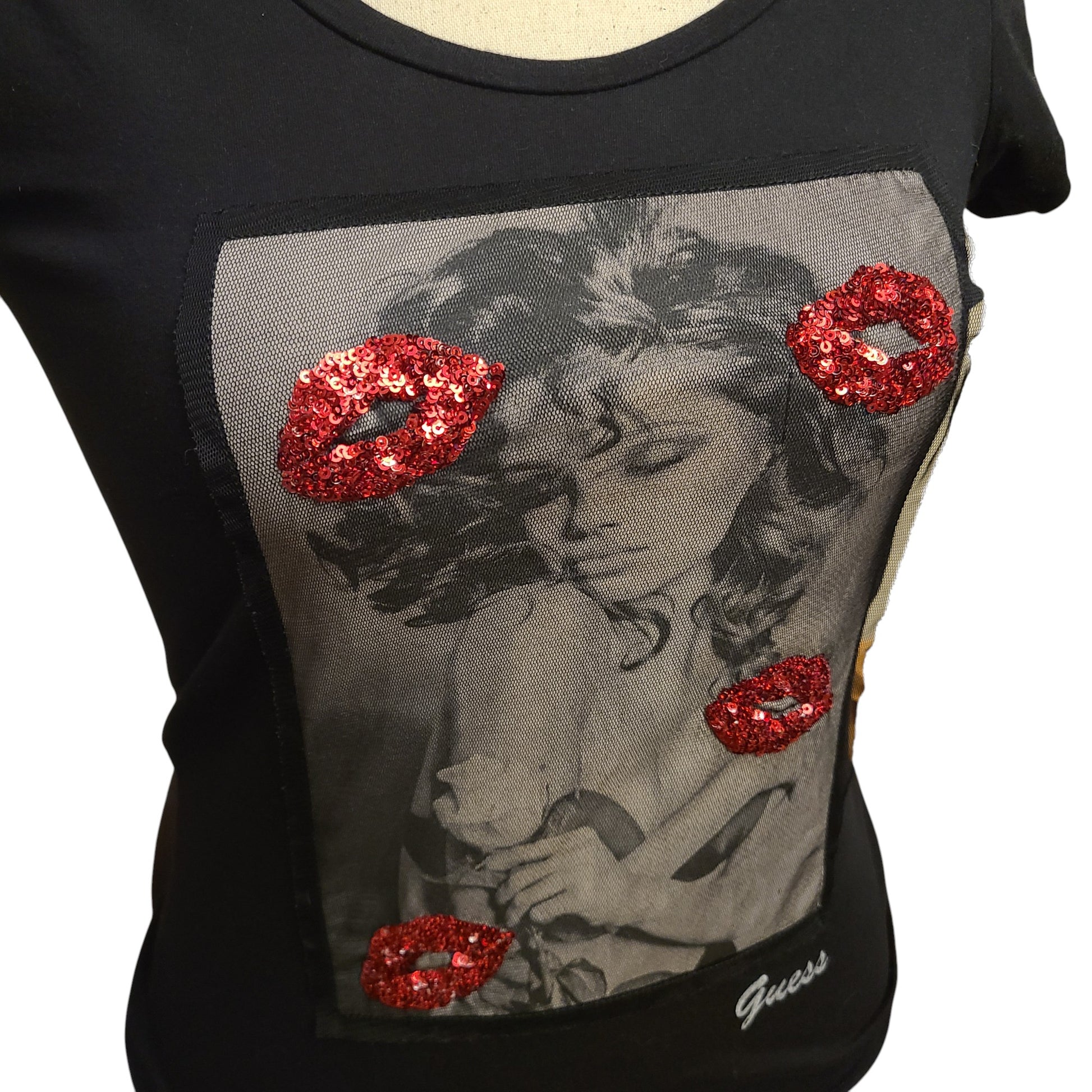 Y2K Classic Guess T-Shirt Mesh Panel over Model Graphic and Sequin Lips.