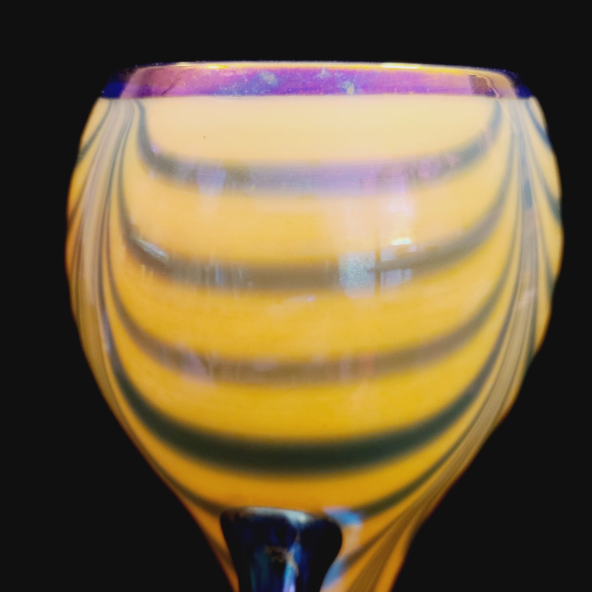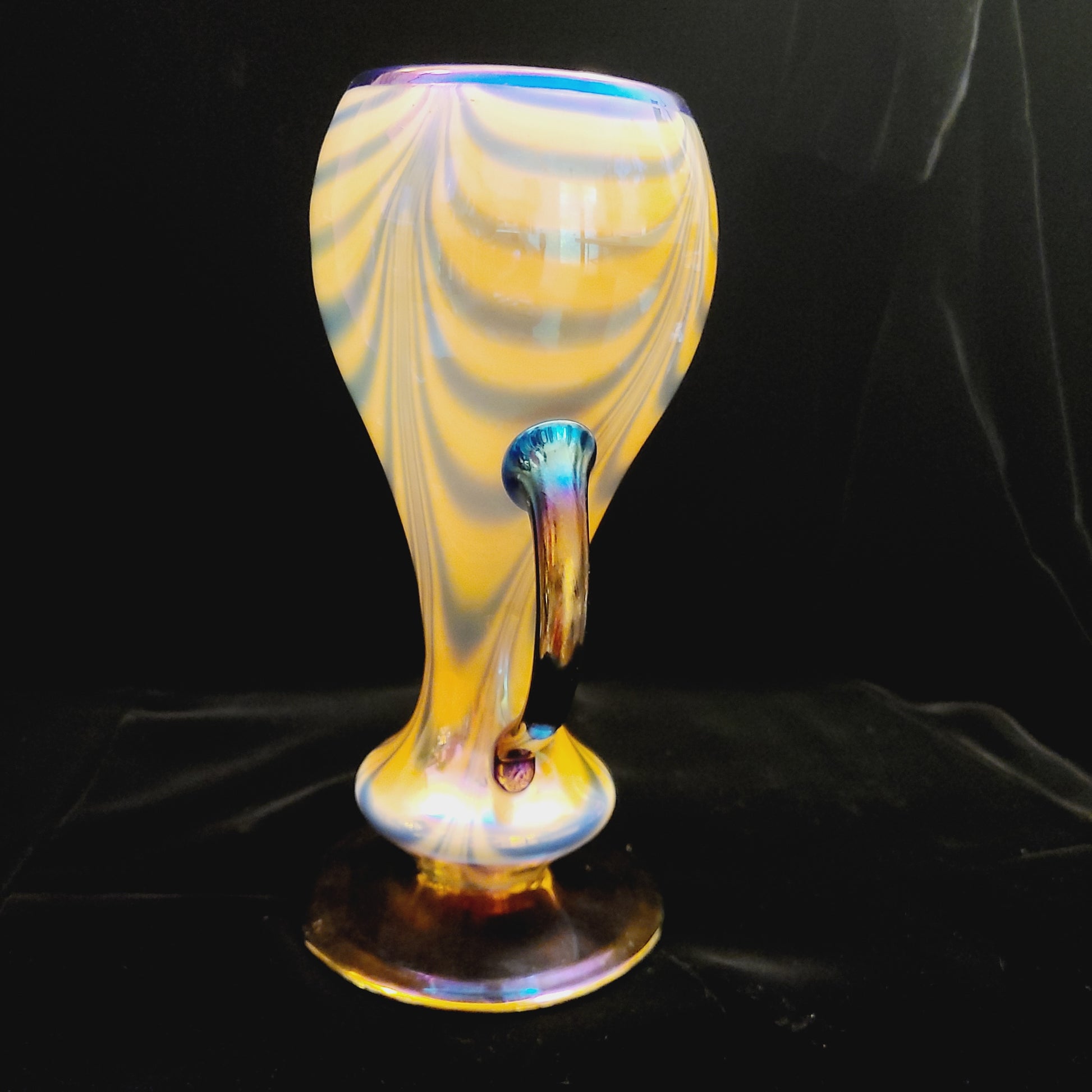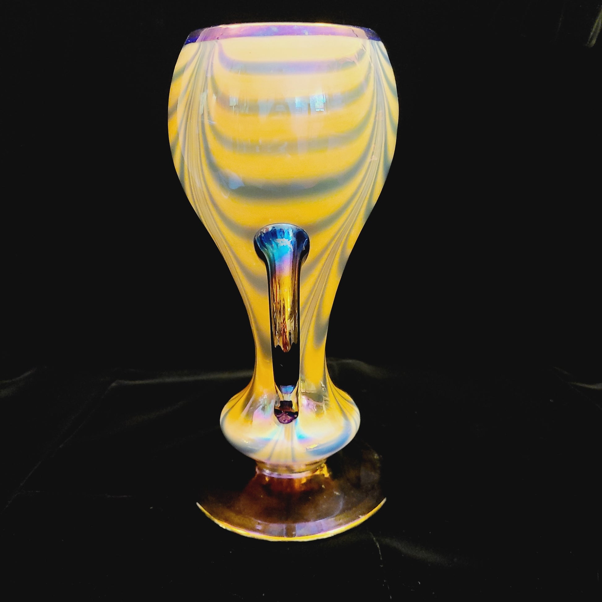 This remarkable and rare vase has a stunning butterscotch mirror finish over wide drag loops or drapes, with an applied cobalt foot. The handles are cobalt with an iridescent finish.