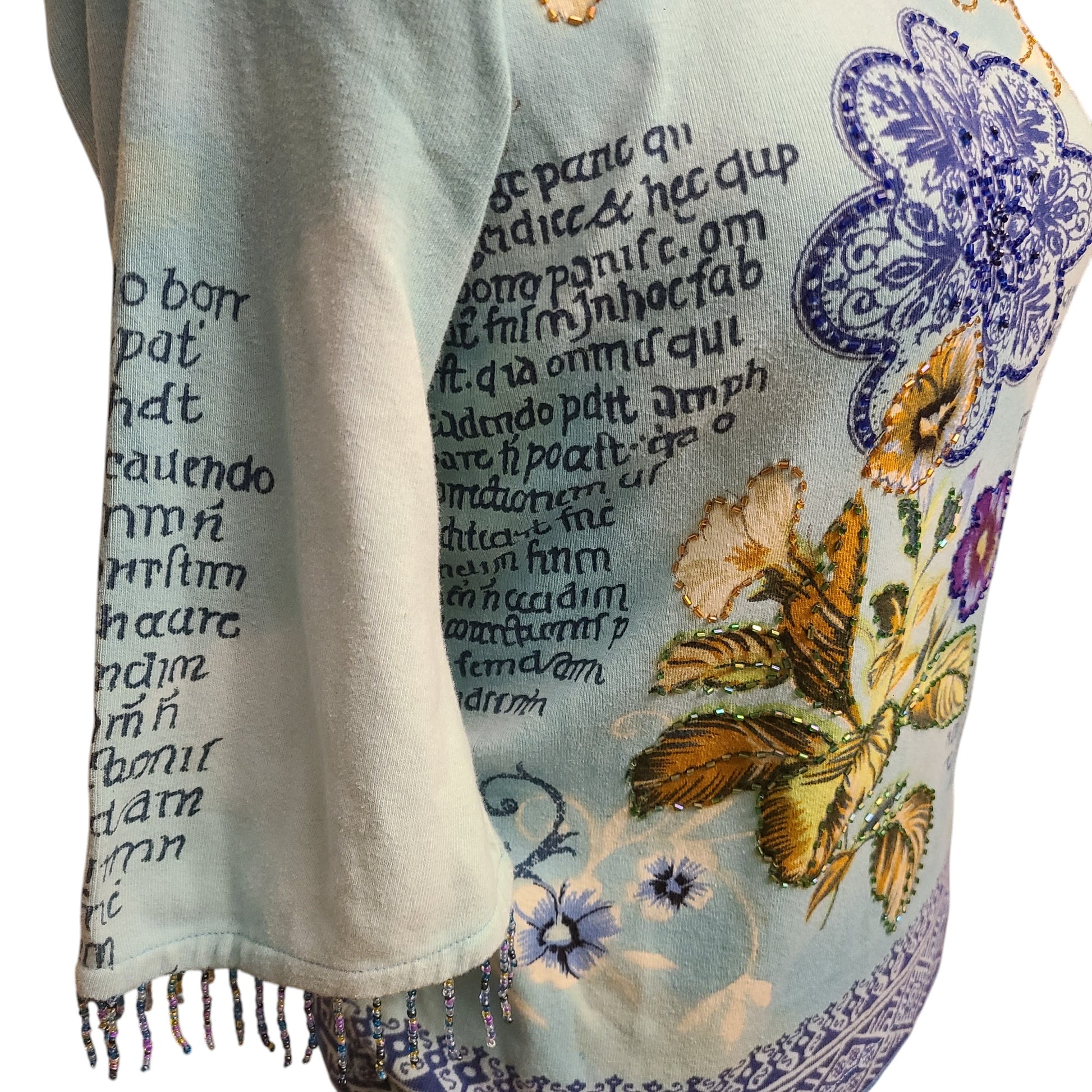 Gorgeous floral motif and exotic characters on the front and sleeves of this insane top. Beading on the front and beaded fringe on the sleeve hem. Marked a small but the measurements indicate a Medium.