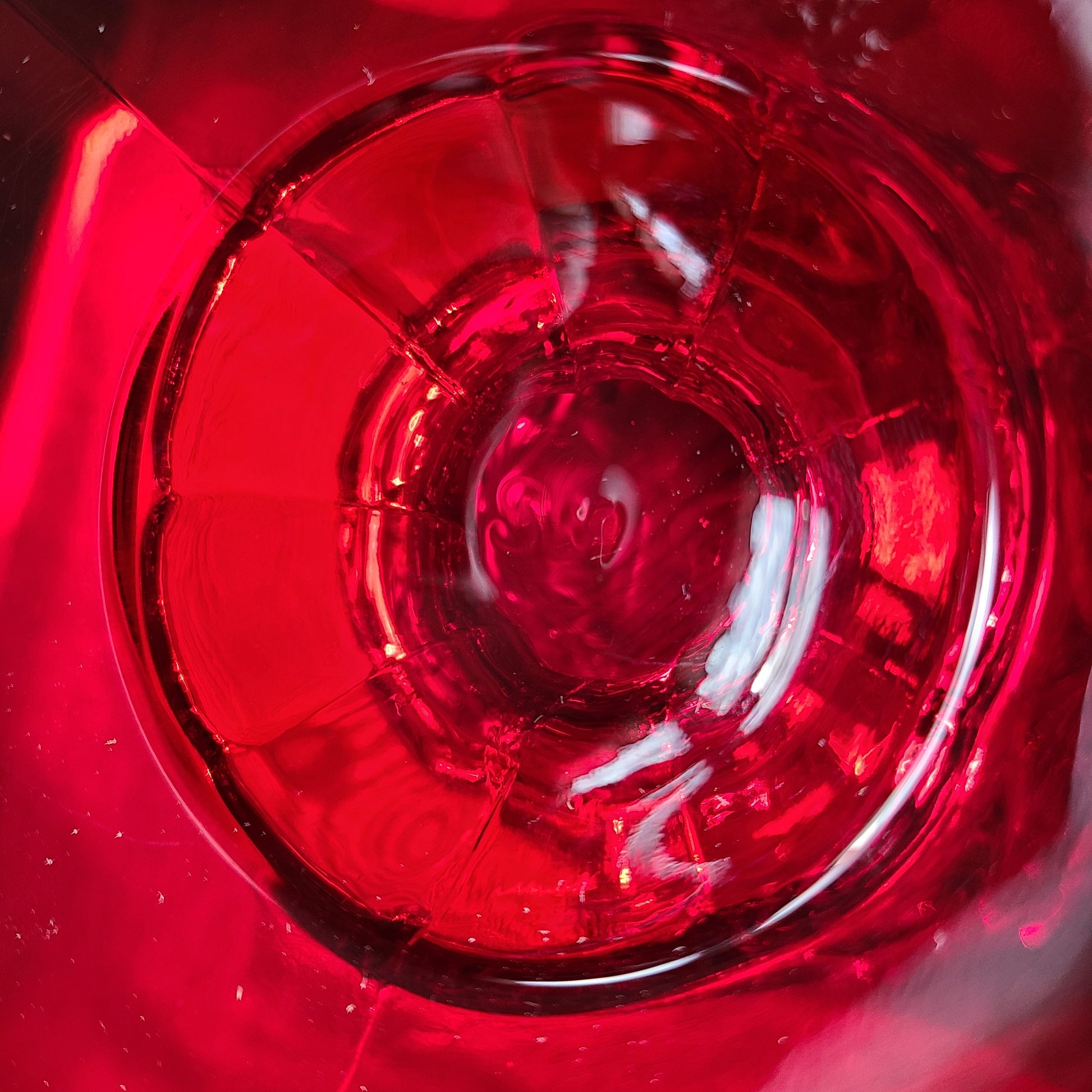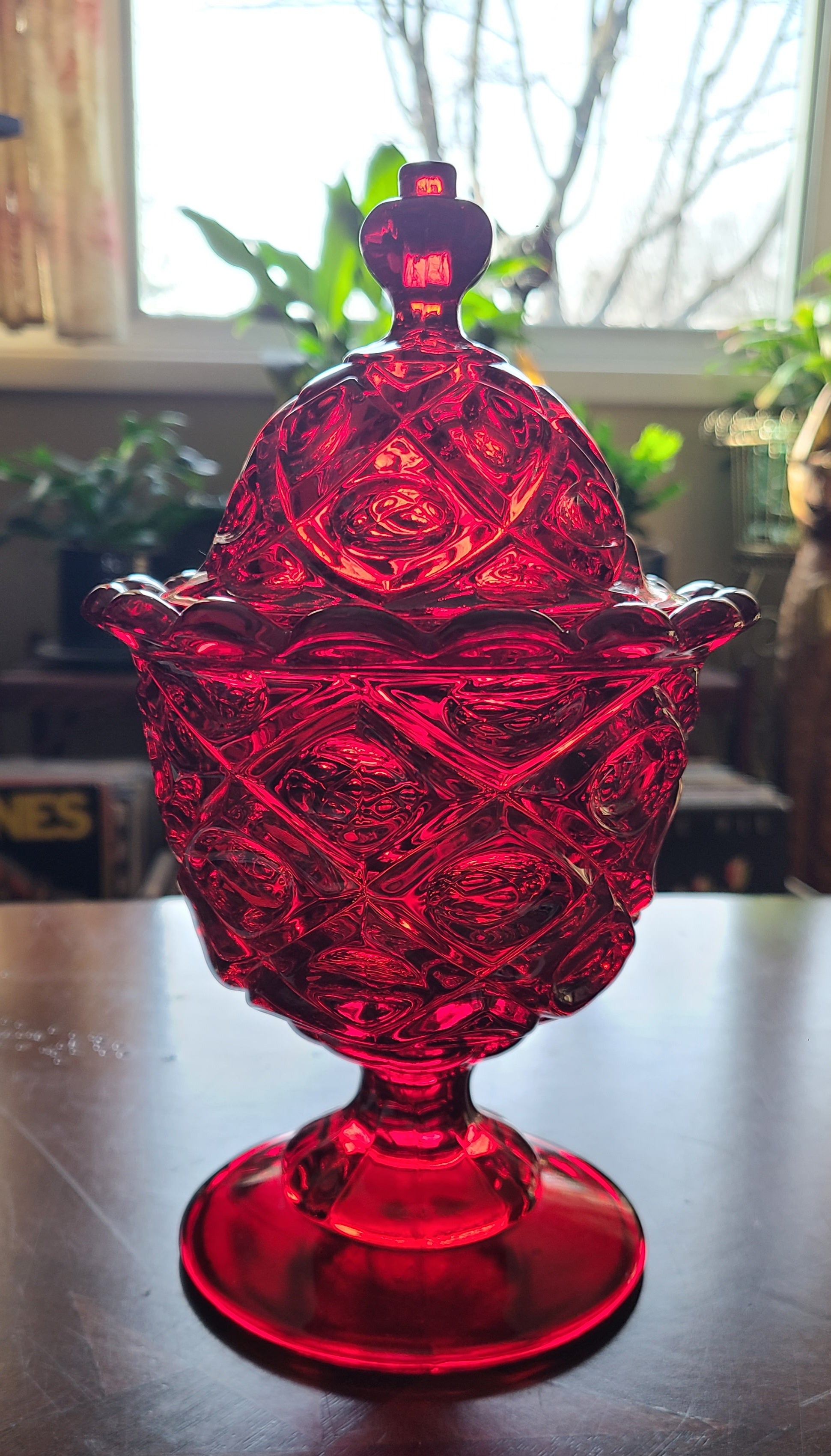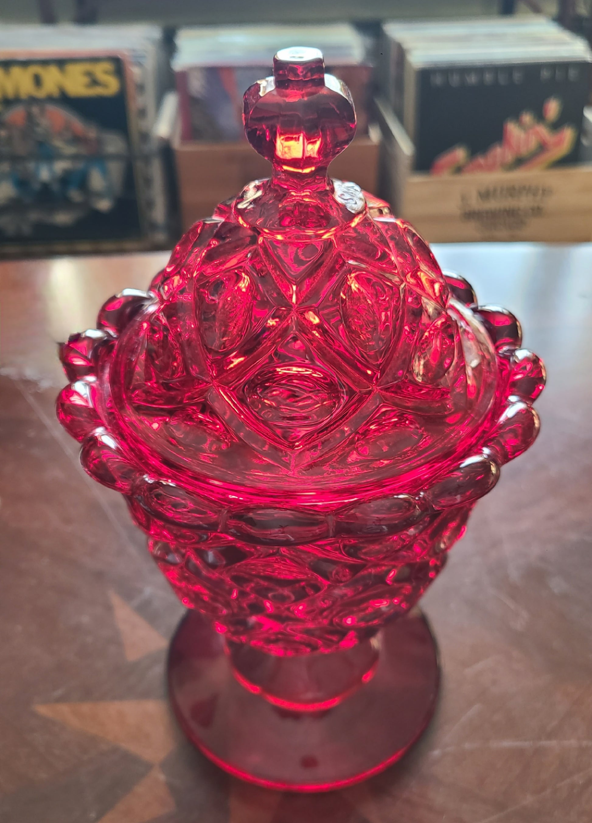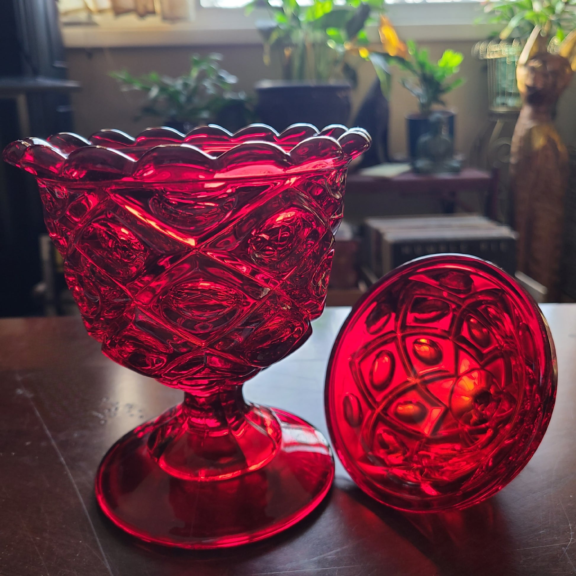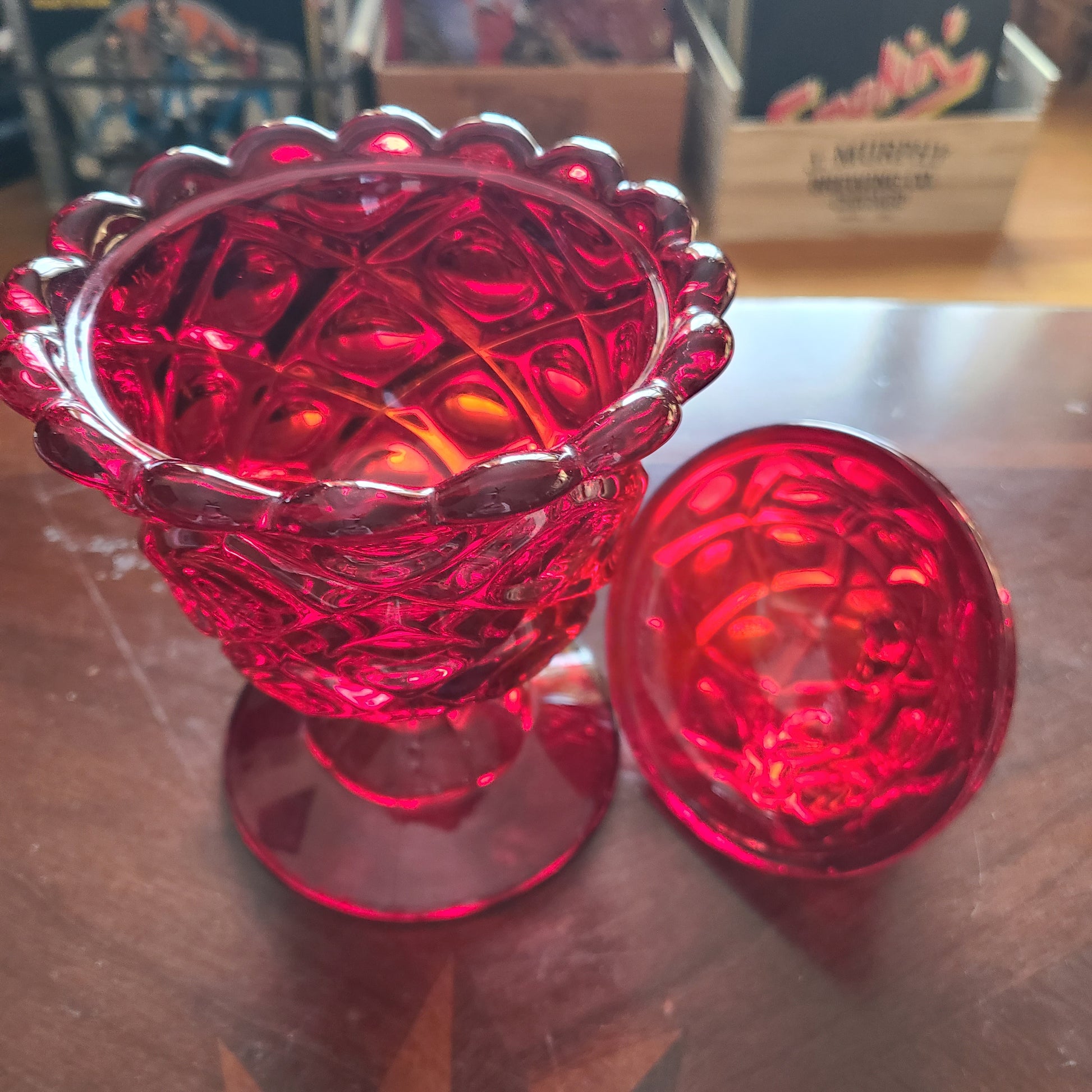 S M Glass Ruby Red Thumbprint Pedestal Lidded Candy Dish