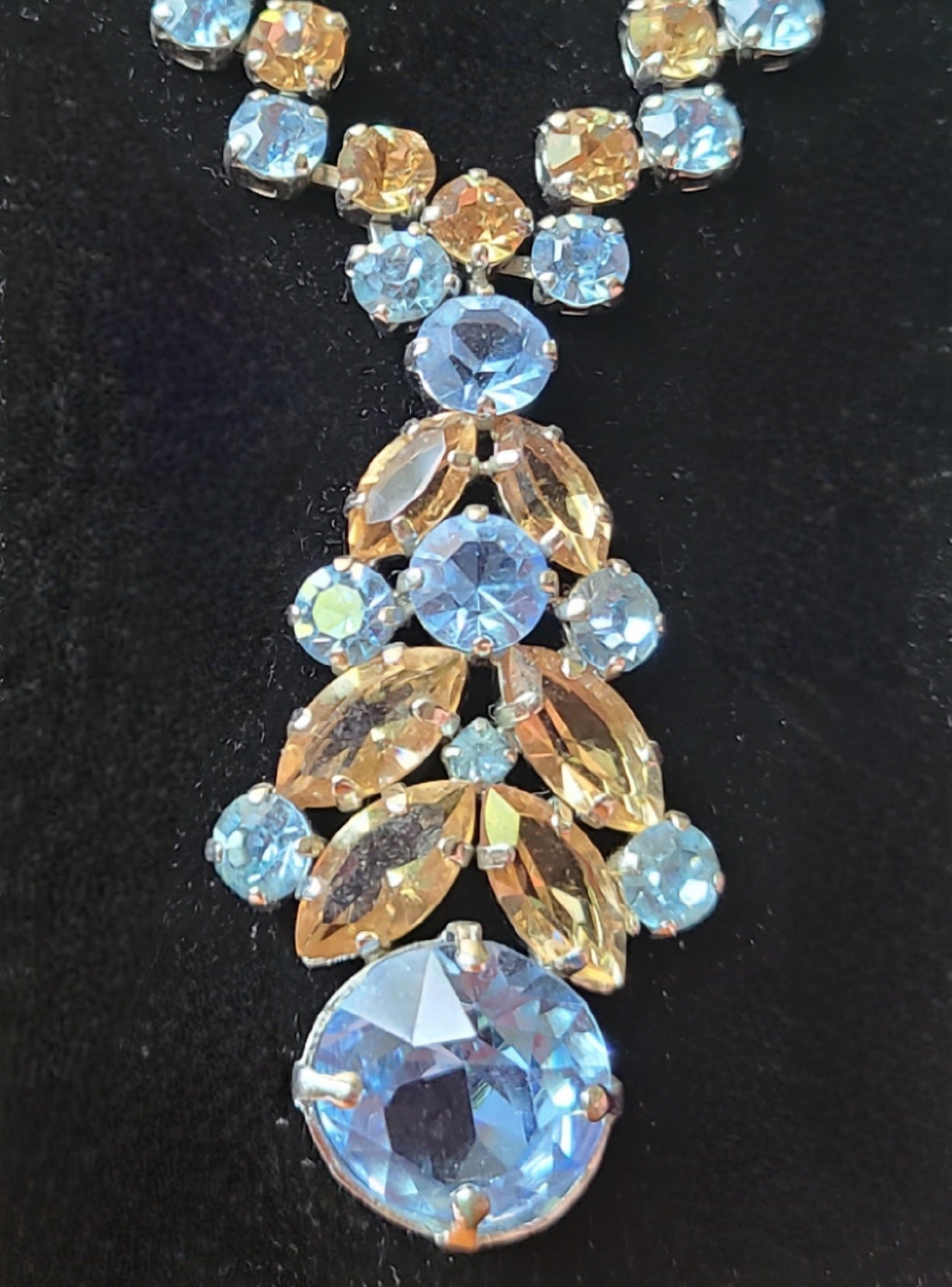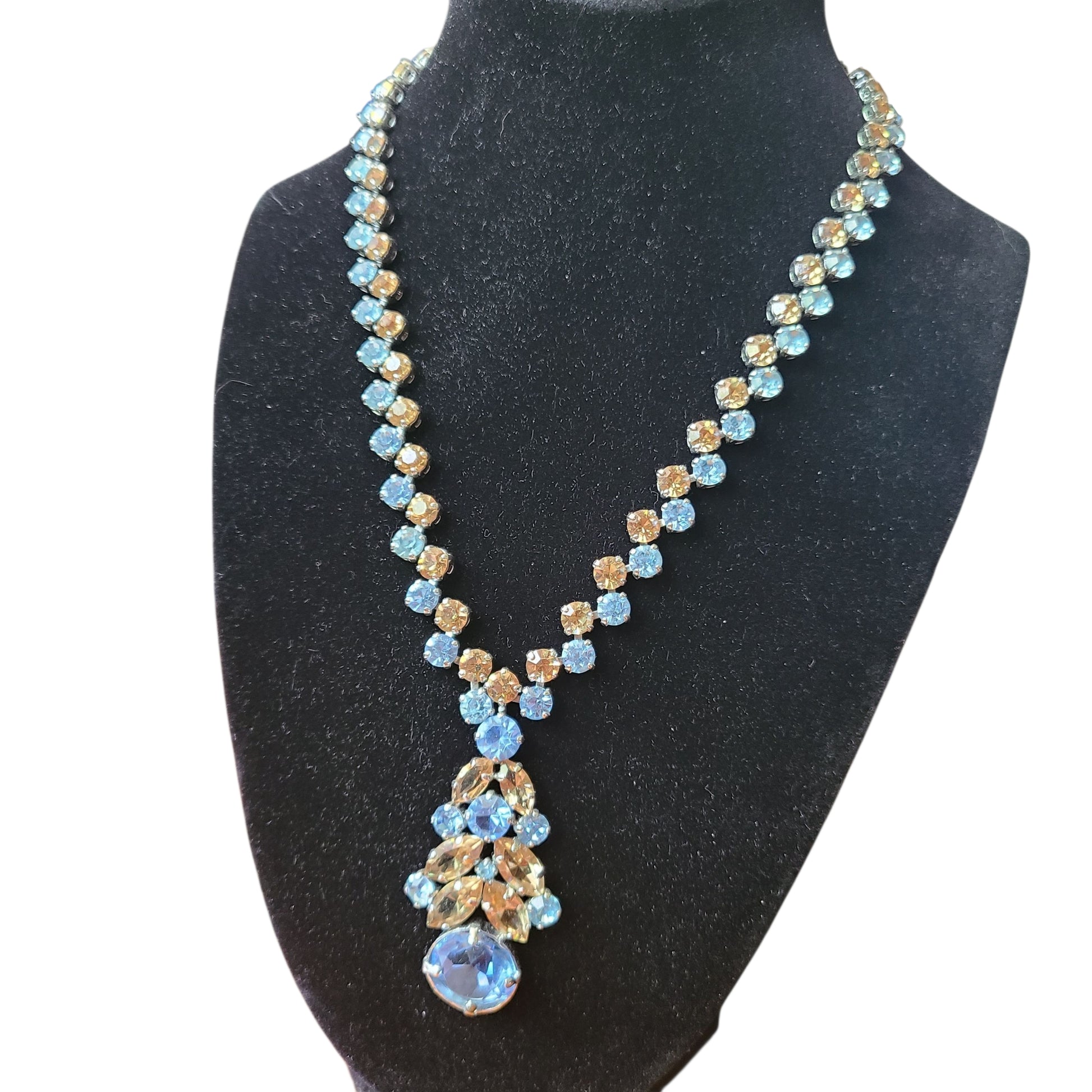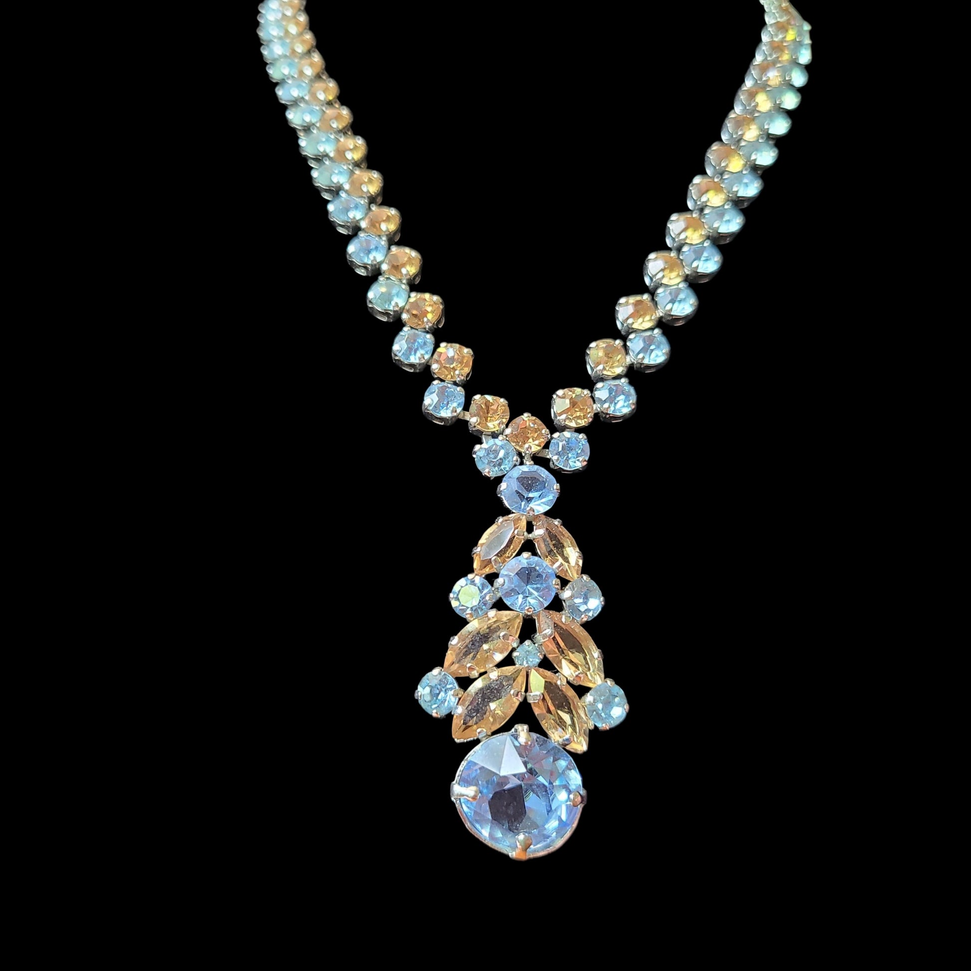 This is a Dior necklace of faceted sky blue and gold glass cut brilliants, signed and dated 1961. The drop pendant is comprised of marquise and round cut stones, culminating in a large singular blue brilliant. An extremely unique piece in exceptional vintage condition!